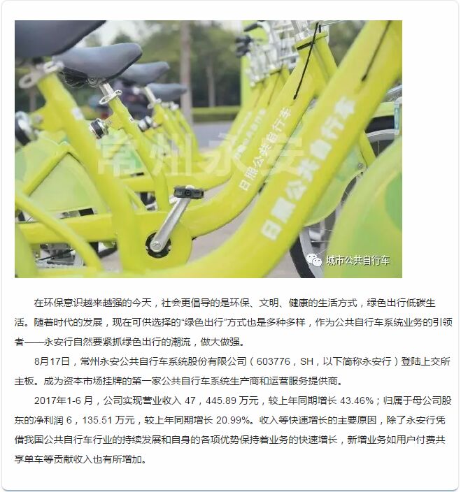 如今,永安行已成功登陸上交所主板。對于永安行來說,本次公開發行上市是一個契機,來保持和強化公司目前的領先市場地位,并充分利用近年來行業高速發展的有利條件,以公共自行車系統為核心產品,豐富業務類型,促進用戶數量快速提高,推動公司業績持續健康增長。接下來永安行還將借助資本平臺來保持企業的長青發展。