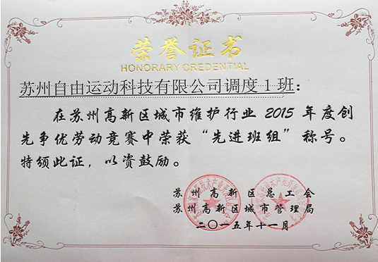 2016年1月28日上午,在蘇州高新區(qū)管委會(huì)召開(kāi)了高新區(qū)城市管理年度工作會(huì)議。對(duì)高新區(qū)城市維護(hù)行業(yè)2015年度創(chuàng)先爭(zhēng)優(yōu)勞動(dòng)競(jìng)賽進(jìn)行頒獎(jiǎng)。蘇州自由運(yùn)動(dòng)科技有限公司調(diào)度一班,在勞動(dòng)競(jìng)賽中榮獲“先進(jìn)班組”稱號(hào)。