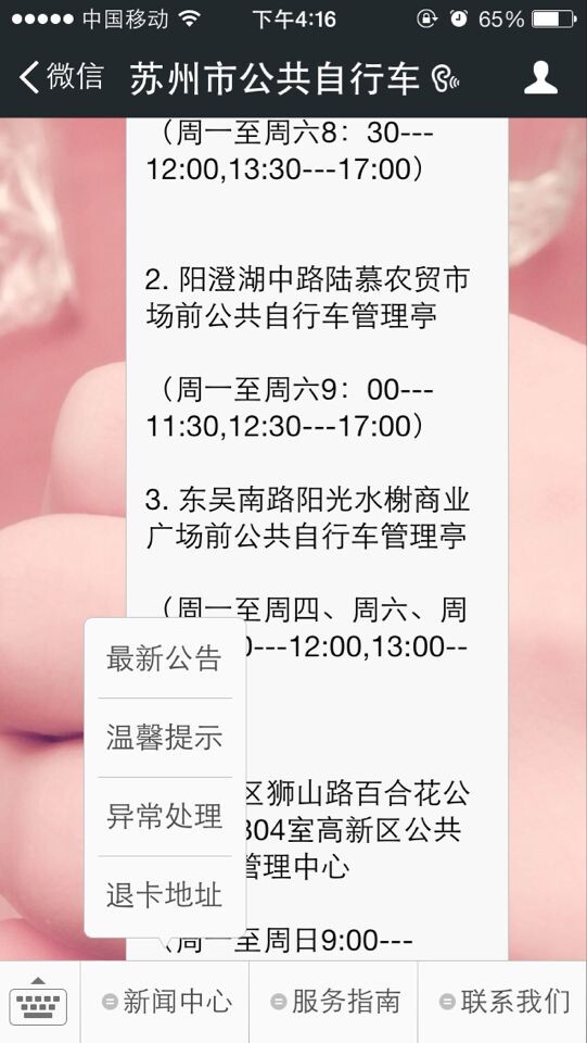 為了更方便市民借還公共自行車,在總公司推出手機微信快捷查詢之后,現蘇州公共自行車也開通了微信公眾號。微信號:ggzxc924943037 微信名稱:蘇州市公共自行車。加入蘇州公共自行車微信之后,微信下方會顯示“新聞中心”、“服務指南”、“聯系我們”,如下圖: