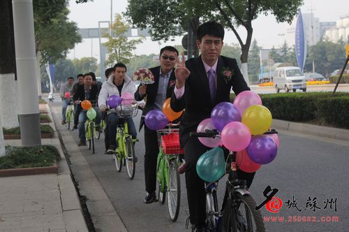 經過再三商議,陳勇決定用公共自行車隊迎娶新娘。于是,10月21日上午11:08,陳勇騎著一輛山地自行車出發,身穿白色婚紗的新娘坐在單車后座,臉上洋溢著幸福的喜悅。