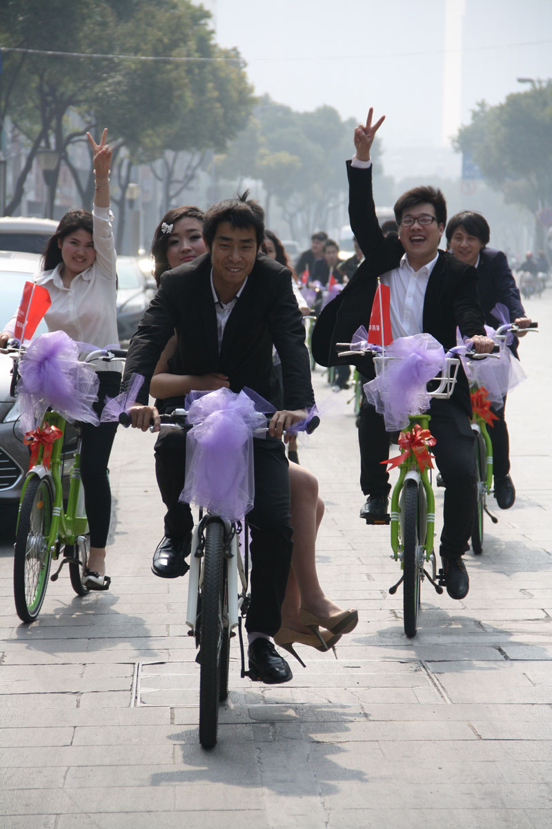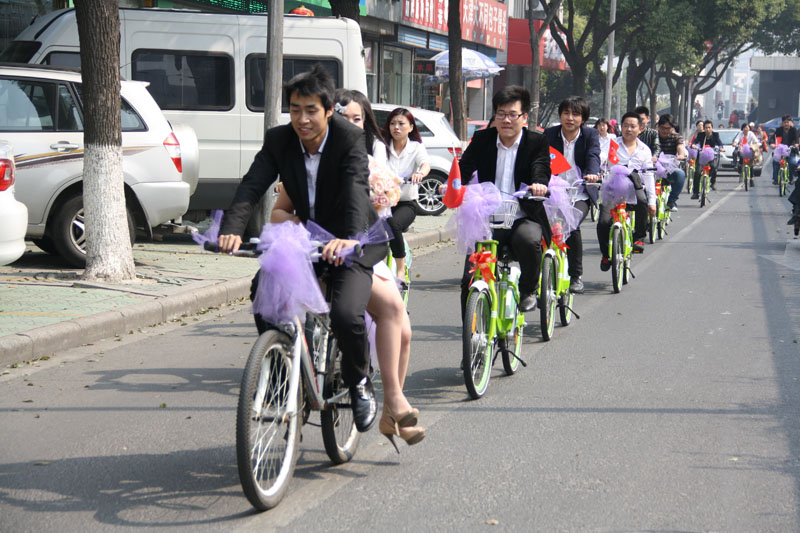 上午10點30分,劉川終于將美麗新娘抱到了自行車上,一溜低碳環保的自行車迎親隊開始啟程,從南大街到清潭,再到勤業,十來公路路程,一路上收到眾多市民的眼光。