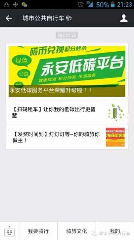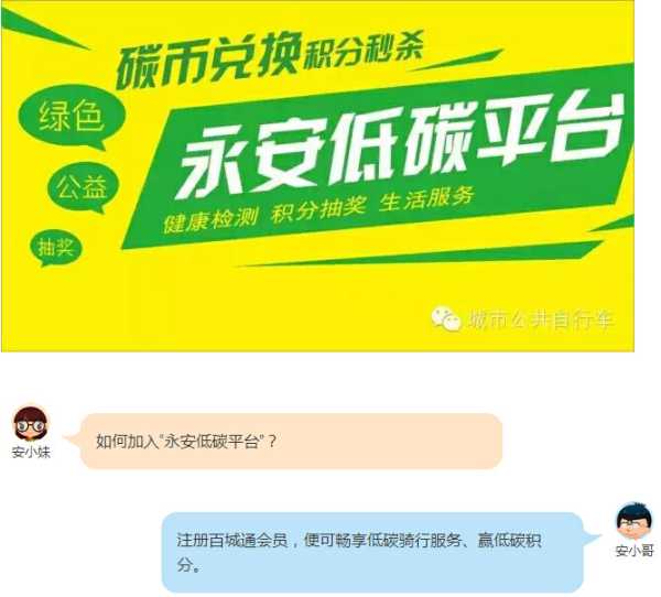 因為您對低碳環保事業的貢獻,我們為成功注冊 “ 永安百城通會員 ” 的每次有效騎行計算碳積分,而碳積分會自動轉換為“碳幣 ”存入您的低碳銀行賬戶。 “百城通”會員的碳幣,即將實現在永安低碳平臺上進行碳幣交易,兌換相應的商品,同時也可進行“碳公益 ”、“積分秒殺 ”“積分抽獎 ”等一系列的優惠活動。快快告訴您的好友及家人,“永安低碳平臺”保存了你們的歷史騎行碳積分,趕快來把它們轉換為“碳幣”吧!(溫馨小提示:3個月后我們將不再進行歷史碳積分的轉換服務了哦~)。 “永安低碳平臺”,讓你成為”低碳達人”,帶您體驗精彩人生! |