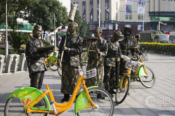 他們是株洲職工大學(工業學校)大一的學生,希望通過這些古代造型與現代自行車的對比,讓大家注意到愛護公共財物也是學習雷鋒。