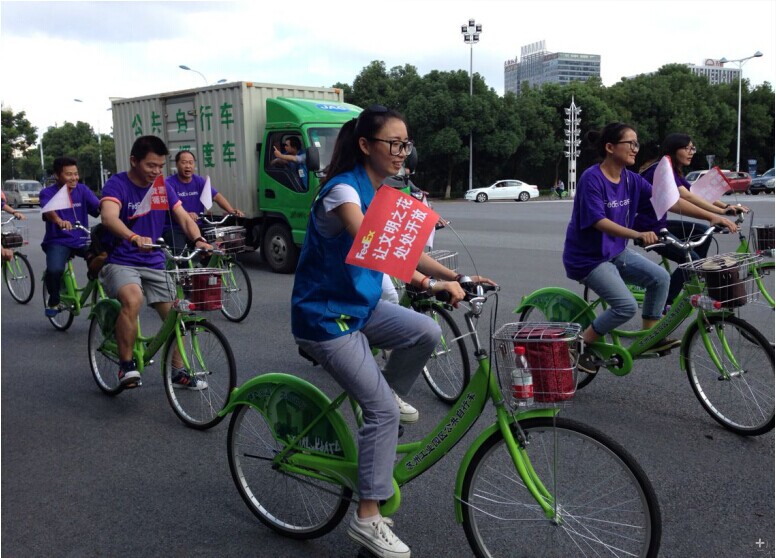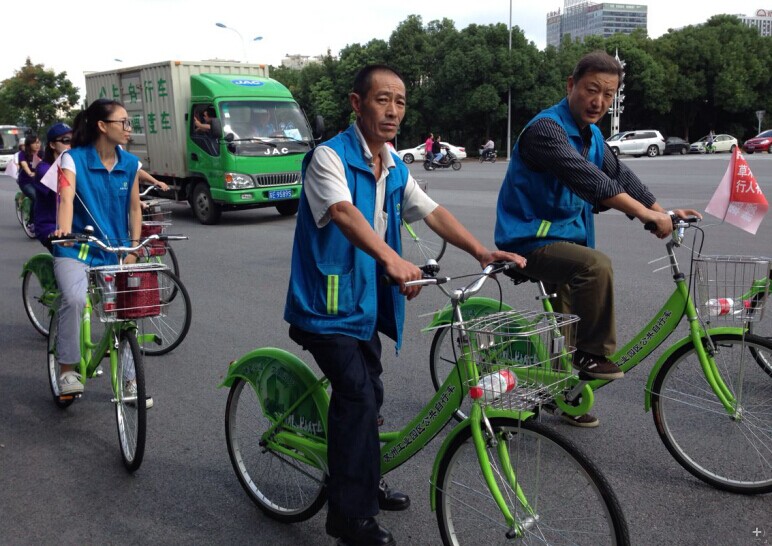 這次活動(dòng)準(zhǔn)備了30輛綠色自行車,掛上環(huán)保旗幟。沿著園區(qū)的主干道進(jìn)行了1~2小時(shí)的騎行。騎行隊(duì)伍分為兩支,一支主要圍繞湖西商業(yè)中心進(jìn)行騎行,一支圍繞湖東圓融廣場(chǎng)騎行。沿路向環(huán)衛(wèi)工人等戶外工作人員發(fā)放愛心禮品。