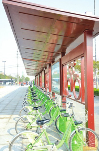 昆山公共自行車二期項目新增設的150個站點(含擴容)3000輛自行車12月25日投入使用。為方便市民,主管部門在二期項目中為公共自行車站點增設了雨棚。圖為新建的公共自行車二期雨棚。