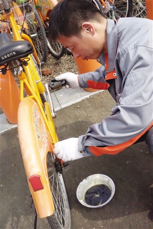 圖為工作人員正在檢修公共自行車。(張婷攝)