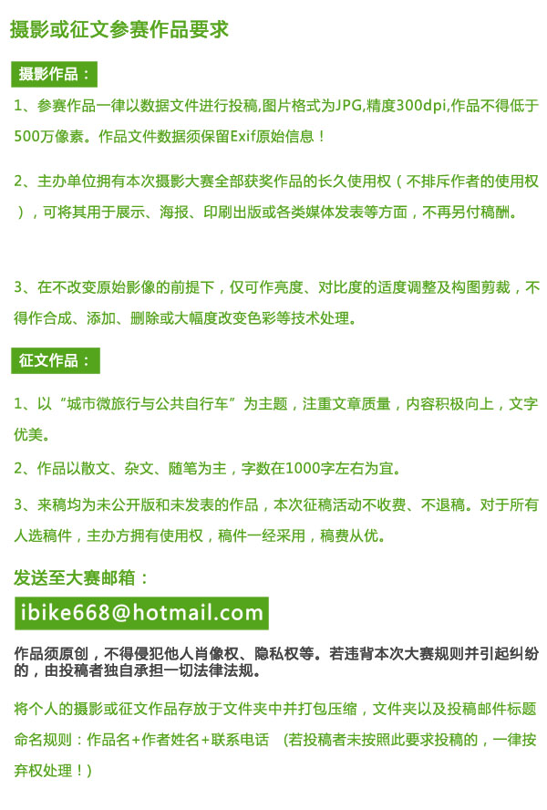 文采飛揚的你;愛街拍的你;愛騎行的你;愛旅游的你;我們找的就是你!豐富獎品等你來拿!即日起至2014年12月12日,【城市微旅行之尋找最美公共自行車站點】攝影和征文大賽作品征集中。