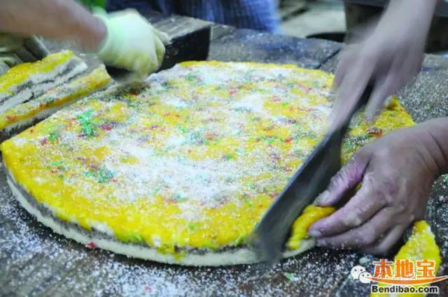 此外,重陽糕的另一特點是好看,除了糕之間有芝麻屑、豬油、豆沙和糖拌成的餡料外,表面因為灑上了不同顏色的“漿水”,而呈現出了不同的顏色。
