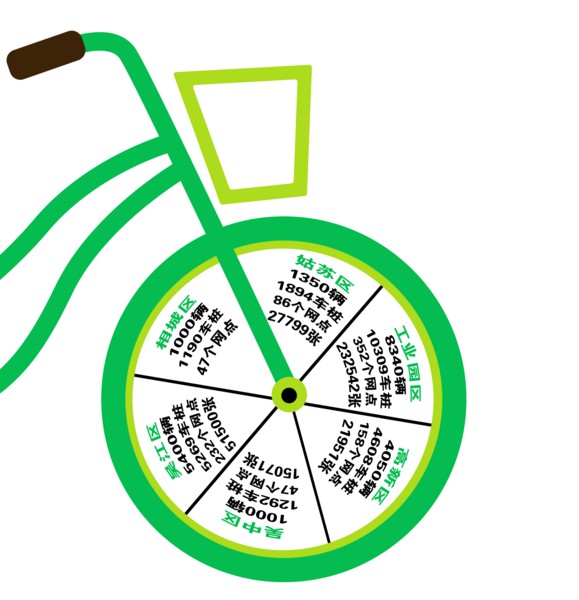 截至8月30日,姑蘇區、工業園區、高新區、吳中區、吳江區、相城區總計投入公共自行車21140輛,近35萬市民辦理了公共自行車卡。