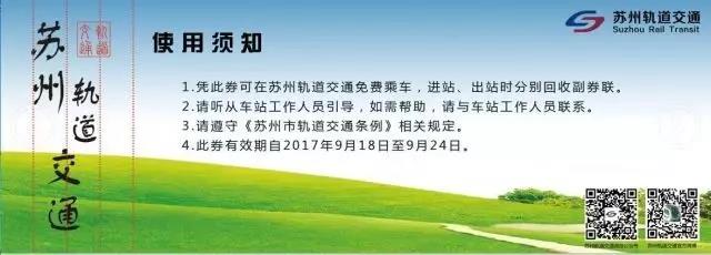 活動四:積極倡導全民乘坐公交9月16日9:00-17:00,蘇州軌道交通將派發免乘體驗券,市民可以憑行駛證原件至軌道交通1號線玉山路站、廣濟南路站、東環路站、星湖街站;2號線陸慕站、三香廣場站、寶帶橋南站、月亮灣站;4號線蘇州灣東站、南門站、孫武紀念園站、越溪站,以上12個車站的客服中心領取免費體驗券,每張行駛證原件可領取2張免費體驗券。市民憑免費體驗券可在2017年9月18日至9月24日運營時間內免費乘坐蘇州軌道交通。每張體驗券可使用兩次,一人一票。