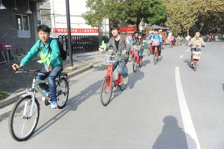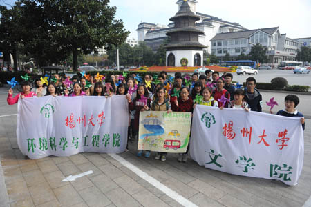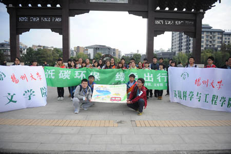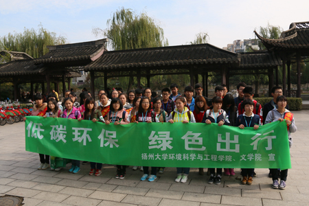 為宣傳“低碳環保,綠色出行”的理念,獻禮揚州建城2500年,11月9日上午,揚州大學環境學院與文學院的同學們以“把綠色奉為夢想,把夢想視為行動”為宗旨,發起了一場“綠色揚州行”活動。同學們踏起揚州公共自行車,騎行揚州城,向市民發出倡議——“將低碳生活進行到底。”