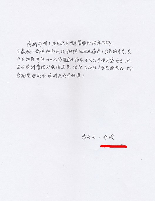 失主認(rèn)領(lǐng)后非常感動(dòng)隨及拿出一部分作為酬謝,被茆師傅和李師傅婉言拒絕!失主非常感動(dòng),他說(shuō):“我是從北京到蘇州旅游的。今天在園區(qū)金雞湖附近游玩不慎將包遺忘了。本以為找不到了,沒(méi)想到不超過(guò)2小時(shí)你們就聯(lián)系到我了,非常感謝你們。蘇州園林真美、蘇州市民的素質(zhì)真高!”