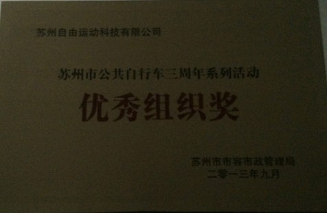 為倡導“低碳生活,綠色出行”理念,進一步鞏固和提升我市公共自行車服務與管理水平,按照我市開展無車日活動工作的統一部署,結合《“綠色蘇州夢 我們在行動” 蘇州公共自行車啟用三周年系列活動方案》,蘇州市市容市政管理局于2013年4月---9月開展了蘇州市公共自行車啟用三周年系列活動。在各級部門的廣泛發動和認真組織下,活動取得了圓滿成功。本次活動得到了社會各方的關心和支持,也得到了市民群眾的熱烈響應和參與積極,有效傳播了“綠色出行”理念和公共自行車文化,取得了良好的社會效果。在此次活動中我公司被授予“優秀組織獎”的榮譽稱號。