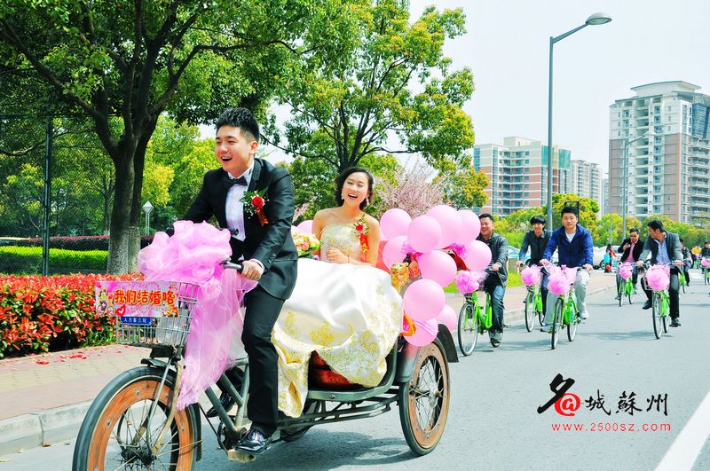 “婚禮,作為人生一項(xiàng)非常重要的階段和儀式,我想讓它更有意義,更有紀(jì)念價(jià)值。于是便和女朋友商量,策劃了這場(chǎng)綠色婚禮?!笨娤壬f,他和同事們一起,借了二十輛綠色環(huán)保公共自行車,“三輪車就是我們的婚車。”