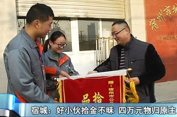 宿州公共自行車管理中心工作人員李文龍在外作業(yè)時,在公共自行車車籃里撿到了一只裝有4萬元現(xiàn)金的皮包,并通過管理中心查詢到了失主的聯(lián)系方式,把丟失的財物交還到失主付先生手里。據(jù)付先生回憶,當(dāng)天上午,付先生在騎完公共自行車以后,回到單位才發(fā)現(xiàn)忘記把隨身的包帶走,正著急的時候,就接到宿州公共自行車管理中心的電話讓他來認(rèn)領(lǐng)。為表感激,付先生特意來到管理中心給李文龍及所在的宿州公共自行車管理中心贈送了錦旗,并想以一定現(xiàn)金表示感謝,但李文龍婉言拒絕,并表示他只是做了自己應(yīng)該做的事。