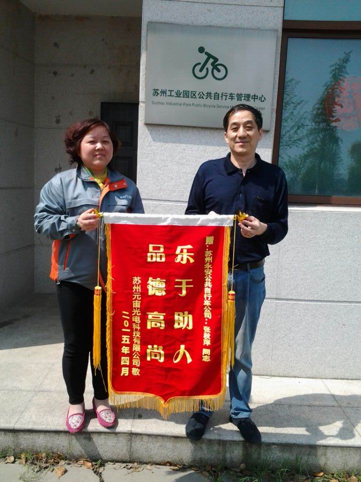 2015年4月23(周四)日中午,蘇州公共自行車經理助理張女士檢查公共自行車站點時,撿到兩個文件袋,她在當地等了很久,無人認領。方打開文件袋檢查兩個文件袋,發現文件袋內裝有寶馬、本田的機動車登記證書、車輛購置稅證明(正本)、保單各一份,從保單上查找到失主的單位。張經理隨即打電話給客服人員,通過百度查詢失主的單位電話號碼與失主同事取得聯系并交還給失主同事。此時,失主并無察覺到物品遺失。