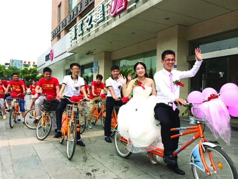 □商報記者 崔陽陽 文/攝 在蘇州,結婚車隊不乏開著寶馬奔馳,抑或更為豪華奢侈的進口大牌車。可昨天,吳江區的一對小夫妻,卻選擇了另一種新奇浪漫的方式,公共自行車成了新郎迎娶新娘的另類座駕。盧云龍,剛大學畢業的一伙子,用他的汗水和誠意娶上了心目中最美的媳婦。 吳江區江陵西路的一小區里,鞭炮、禮杖聲聲入耳,有個小子要娶媳婦,竟然用的是公共自行車!這個消息傳遍了整個小區。20輛公共自行車整整齊齊地排列在盧云龍家樓下,每輛自行車的車頭還掛著喜氣的紅花,其中最醒目的雙人自行車正是盧云龍迎娶新娘鄭丹的牛氣座駕,粉色的氣球組合在車頭迎風飄逸。一大早,吳江區公共自行車管理中心的工作人員就已經把這20輛自行車送到了盧云龍家樓下。工作人員告訴記者,新郎是通過12345市民熱線聯系到他們的,當得知自行車是用于結婚車隊時,中心決定免費為新郎提供,還專門送到家。“這也是低碳環保的一種方式,我們當然會支持。”工作人員說。 盧云龍騎著雙人自行車,帶著他的那幫哥們姐們,在酒店迎娶到了他心愛的姑娘鄭丹。“我老婆是山東淄博人,所以迎娶前就把她安排在酒店里。”天氣的炎熱讓盧云龍滿頭大汗,卻掩藏不住他娶媳婦的興奮,被抱上車的新娘鄭丹也是笑靨如花。中山北路、江興西路、西塘河路、江陵西路,自行車迎親隊一路洋洋灑灑,振臂高呼“新婚快樂”,引起了不少路人的注意。家住嘉鴻花園的畢先生告訴記者,“今天周末起了個早,沒想到看到用自行車結婚的新鮮事,現在年輕人了不得。”據了解,這次騎自行車結婚的策劃幾乎都是新郎一人全程策劃。大到和城管聯系借到公共自行車,小到上淘寶買紅色“搶親”t恤,都是盧云龍一手操辦。“寶馬奔馳的車隊太多了,我和她想有個不一樣的記憶,組個自行車隊迎娶不僅低碳環保,也重溫了一把大學時光,我倆都覺得很浪漫。”新郎盧云龍開朗而熱情。盧云龍和他的新娘鄭丹都是青島農業大學的大四畢業生,小夫妻兩人在大一的時候就相識了。“那是一次上公開課,我去得晚,也找不到其他座位,就坐到了她的身邊,就這樣聊了起來。”沒想到一聊就聊成了一對眷侶,兩人到大一期末時就正式走到了一塊。接下來的三年時光,兩人最美好的回憶,莫過于兩人各騎一輛車去學校后面的山上玩。“那就是我們的約會。山上有許多果園,我倆一路騎行到山上,付給果農50元,里面的蘋果、梨子、櫻桃,有啥都可以摘著吃,每次都盡興而歸。”盧云龍愉快地回憶著。 今年6月兩人同時從大學順利畢業,看著周圍的朋友不少畢業就分道揚鑣,相愛的兩人決心給三年的愛一個完滿的結局,他們選擇了一畢業就結婚。“我們愛對方,各方面的條件也成熟,何苦拖時間為難自己?”盧云龍對自己的“畢婚”做這樣的解釋。 對于騎個自行車就把新娘娶回家的建議,最先提出的是他的妻子鄭丹。那時新人雙方家長在一起商量車隊的事,是選用幾萬元的寶馬車隊,還是選擇自家親戚組建車隊,一直爭執不下。這時候新娘鄭丹提了出來,“那干脆用自行車吧。”這個建議剛拋出就遭到了父母的反對,“一生難得結次婚,不用輛好車說不過去,大人們都這么想。”不過最后在小夫妻倆的堅持下,父母終于想通了,還得到了家里不少親戚的支持。“這小奔子,思想很有創意,以前我們結婚的時候是用自行車的,現在他們年輕人又開始流行了,還說寶馬奔馳啥的太土。”盧云龍的舅舅告訴記者,“小奔子”正是盧云龍的小名。(責編:呂琳)
